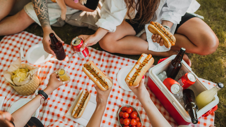 For maximum grilled hot dog control, skewer several through the side in a row before grilling, leaving gaps between each hot dog. This keeps summer's favorite sausages all together for a uniform finish, and it prevents any stray dogs from absconding to the depths of your grill and becoming inedible. You might see variations on this technique circulating on social media come peak grilling season each year, but you can be just as successful with a slightly different tack than some posters tend to take.
