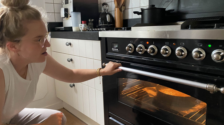 The reason has everything to do with heat distribution and temperatures — which vary quite a bit from the bottom to the middle and top racks. Inside the oven, heating coils snake around the inner roof and bottom of the oven, providing the actual heat which is then circulated. Because of the placement of these coils, the bottom and top of the oven are the hottest zones compared to the middle shelf. This range isn't necessarily a bad thing if you're smart about knowing when to use the top, bottom, or middle shelf. And it's the middle which Berry advises is the ideal placement for your cakes. Slide onto a too-high rack — above the center of the oven roughly, and you run the very real risk of the cake baking too hot and fast, resulting in deep cracks and splits.