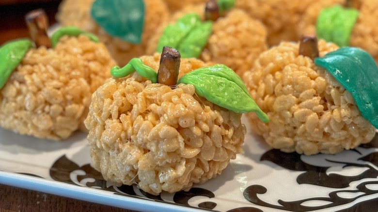 Make Rice Krispies treats that look like they came out of an orchard by creating small, hand-formed orbs decorated to look like apples. Corn syrup is another hack for retaining moisture in your treats to make them last longer that would work well with this somewhat bulkier shape. A pretzel stick stem, an edible modeling chocolate leaf, and red or yellow food coloring will make these beauties look more realistic and dazzling on a plate. You could also use this approach to create autumnal mini-pumpkins.