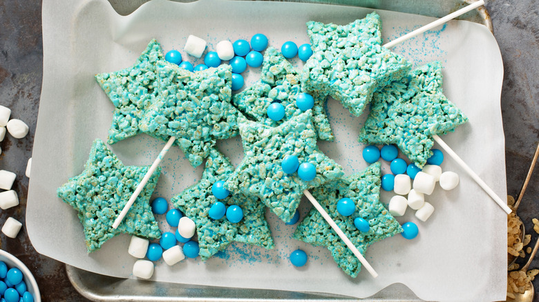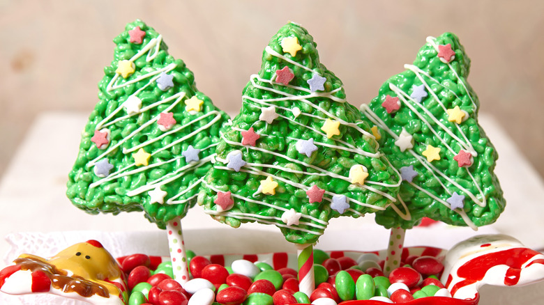 Get ready to sound the nostalgia bells with green-tinted, tree-shaped Rice Krispies treats that scream Christmas. The tree cookie-cutter is another relatively easy-to-release shape (or you could use the wedge shape in a pinch) and the sky's the limit with creating edible "ornaments" using sprinkles and drizzled chocolate "garlands." For richer treats that last a few days and don't become too hard to enjoy, consider adding sweetened condensed milk to your sticky mixture.