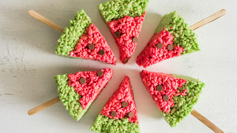 Up your Rice Krispies treats game with a two-tone approach that's perfect for the summer. Take simple wedge-shaped snacks from boring to tantalizing with this re-creation of fruity goodness, which fuses pink and green Rice Krispies mixtures together. Chocolate chip "seeds" pressed into the watermelon "flesh" will be the perfect finishing touch. You can even experiment with adding a stick for a Rice Krispies treat display and mess-free eating.
