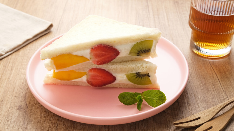 Readily available throughout Japan, whether you're chilling in a cool café or popping into a convenience store, the fruit sandwich — often nicknamed the fruit sando — reigns as a unique handheld. At its core, the fruit sando features fresh fruit slices intricately arranged in a whipped cream filling sandwiched together by white bread. When you slice into the assembled sandwich, the pieces of fruit look nice and tidy at the cross-section, a perfect display of edible food art.