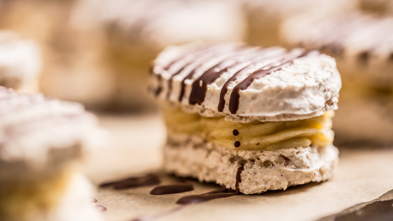 Similar in concept to the macaron, but without the excessively, and at times exhaustingly, delicate je ne sais pas of its French counterpart, a laskonky is a Slovak and Czech sandwich cookie. It should come as a sweet relief to many a tired baker that you don't need to obsess over this simpler baked meringue option. A laskonky has two thin and crispy meringue rounds, which contain a buttercream filling. The filling is often caramel-flavored, but it could be offered in other flavors like vanilla, coffee, or chocolate.