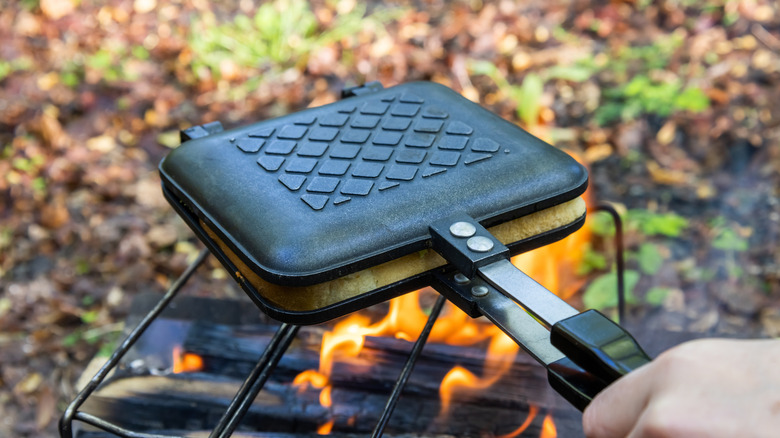 Once you assemble your sandwich, place it in the skillet, close and secure the lid, then hold it over the flame for a few minutes until your sandwich is warm or cooked to your liking. The best trick to achieve crisp, toasty, golden-brown edges is to grease the interior of the skillet with a thin layer of butter prior to cooking the sandwich. And don't forget to rotate the skillet occasionally for the most even cooking.