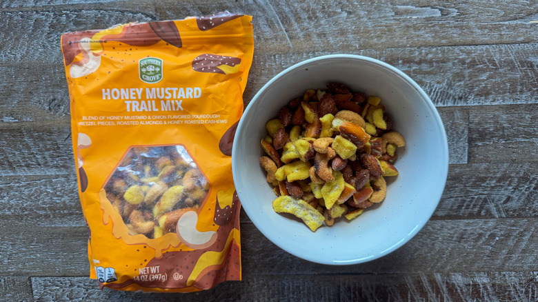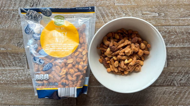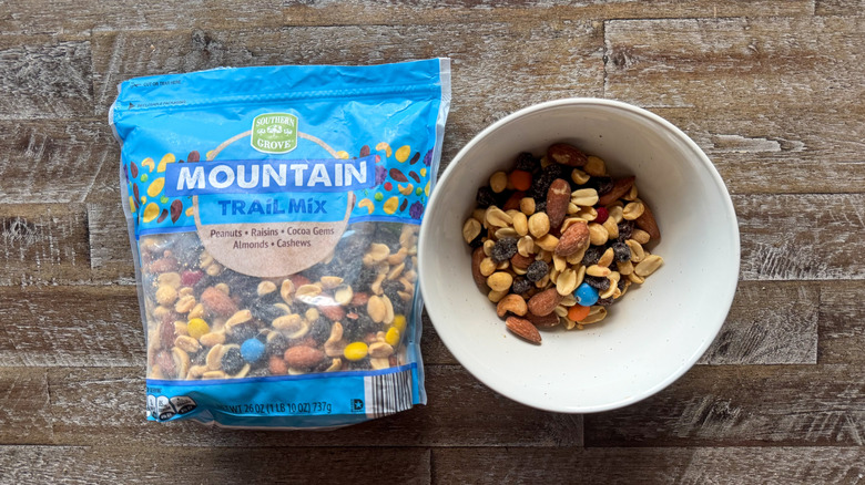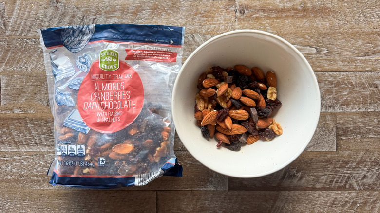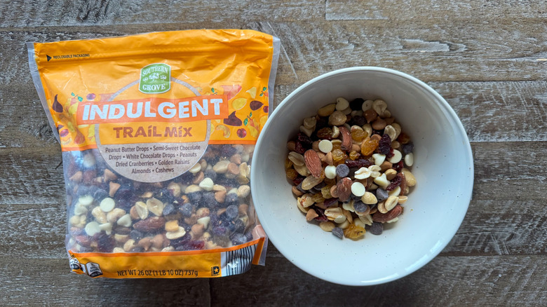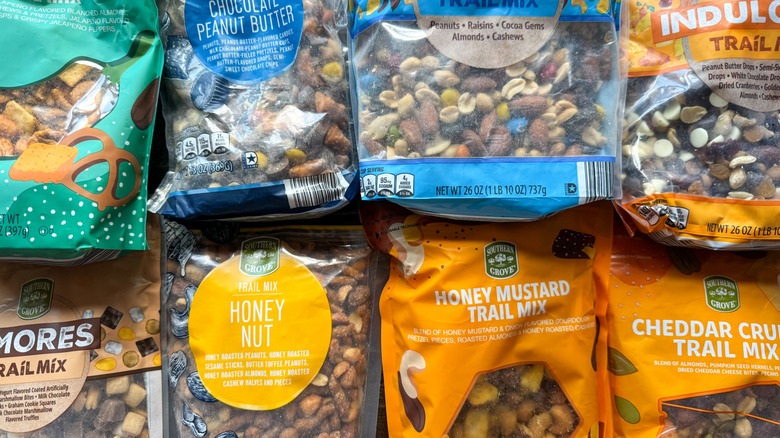 My favorite grocery store, Aldi, boasts a surprisingly extensive selection of trail mixes. One of its many private-label brands, Southern Grove, carries no shortage of them. There are sweet ones, savory ones, nutty ones, and candy-focused ones. The brand even used to carry my favorite trail mix, one that was chock-full of peanut butter cups, cherries, cashews, and almonds. When I saw that my local Aldi stopped selling it, I was admittedly distraught. But instead of letting myself sink into despair, I used it as an opportunity to expand my horizons and sample Aldi's trail mixes to, hopefully, find a new favorite.