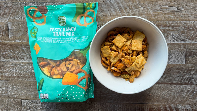 I expected that this trail mix would deliver more on the "ranch" component of the label, and I think those fresh herbs and buttermilk undertones would have served the components well. But Aldi saw jalapeño and ran with it, and it came to the detriment of the bag's other components. Even the "cornbread" chips, which taste like Aldi's almond flour crackers, were given the short end of the stick. I even laughed when I saw Aldi markets these as being "cornbread," as they bear no resemblance to the soft, skillet cornbread I've come to know and love. All in all, it's not a bad trail mix — it's just not what the label insinuated it was.