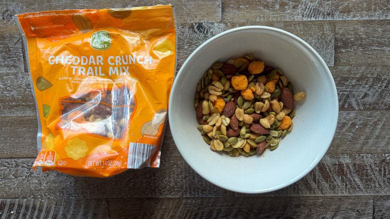 How had I never thought to add crispy cheese pieces to trail mix? Aldi knew what it was doing with its Cheddar Crunch Trail Mix, which combines crunchy and fatty cheddar pieces with almonds, pepitas, peanuts, and pecans (the latter of which I thought was a little out of place, but I digress). The cheddar pieces are the star of the show here. They're just indulgent enough to make me say "wow," and they really make the bite unique. However, there are far too few of them in this mix, and I was troubled to see that they were the only cheese-adjacent product in this entire mix. The other nuts and seeds were entirely bland — maybe a little salty, but not nearly enough. If you had removed the cheese pieces entirely, the mix would lose its savory and cheesy appeal.