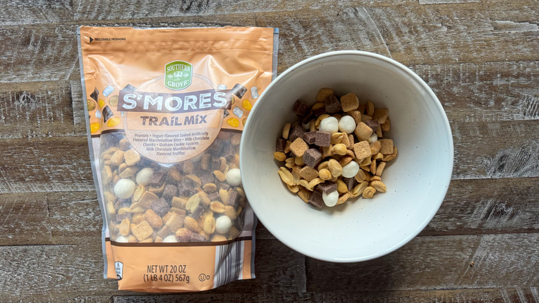 Aldi's version brings together peanuts, "yogurt flavored coated artificially flavored marshmallow bites" (a mouthful), milk chocolate chunks, graham cracker cookies, and milk chocolate marshmallow flavored truffles. In other words, this trail mix is just a bag of sugar, plus peanuts. And the peanuts really feel like they were an afterthought — a box that needed to be checked so that Aldi could get away with calling this trail mix a trail mix. They don't do anything except get in the way of everything else. The truffles, which taste like a cheap, vanilla cream-filled Russell Stover candy, taste so sweet and artificial that I wanted to pick them out of my bag and toss them into the trash.