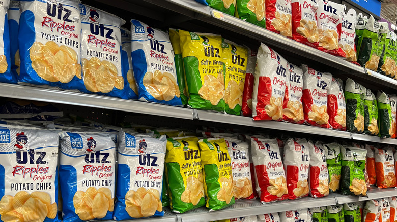 Beware a pig-laced potato chip. The popular Utz brand carries a couple of potato chip products containing lard, including Grandma Utz Kettle-Style BBQ Potato Chips and Grandma Utz Kettle-Style Potato Chips. Other potato chip brands like Gibble's and Good's also contain lard. This ingredient has a flavor many associate with "traditional" style and kettle-cooked potato chips, and it also has a higher smoke point for frying. In barbecue flavored chips, lard also makes sense for that meaty, smoky taste. For the most part, however, chip makers opt for vegetable oil to fry their chips.