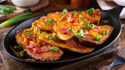 You can give your skins a Latin twist by switching out the bacon in a classic potato skin recipe with carne asada, or al pastor meat or go for a spicy protein swap with some flavor-packed chorizo. Don't forget a dollop of guacamole for some extra texture and flavor. Chopped pieces of grilled steak topped with crumbled blue cheese and chopped chives will give your potato skins an elevated steakhouse vibe. Goat cheese and honey give them an unexpected bougie upgrade.