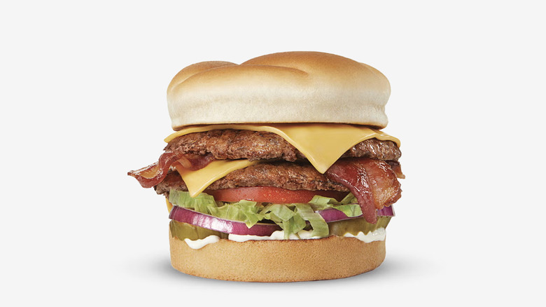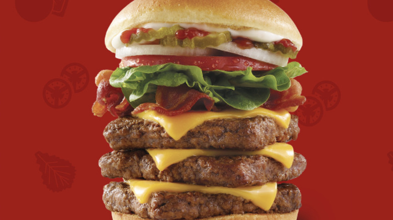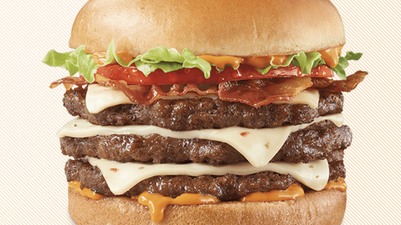 Neither of these extremely large burgers compare to the other, smaller burger options, though, when ranking Wendy's burgers worst to best. There's just so much meat on them and it overpowers the rest of the ingredients. Perhaps if you asked for extra toppings or more cheese, the balance could be restored. That's just what happens when you pile three quarter-pound beef patties onto one burger.