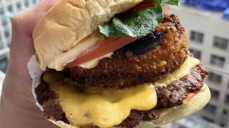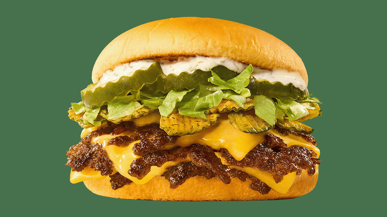 Although it's very tall, the Shack Stack isn't necessarily one of the most highly ranked burgers at Shake Shack (though it is one of its most expensive options). It's a bit of an anomaly, as it combines two very popular burgers — the ShackBurger and the 'Shroom Burger. This is an overwhelming combination of two very different patties, one of which is a portobello mushroom stuffed with cheese. It's all just a little ... much. You're probably better off ordering either a ShackBurger or 'Shroom Burger on their own.