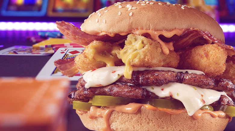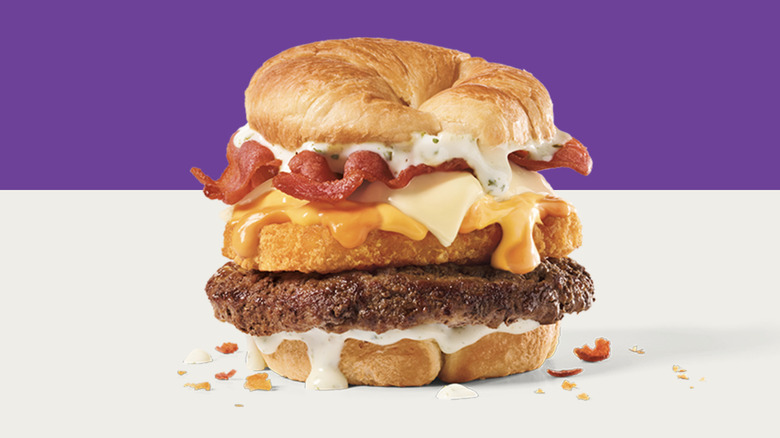 This burger elicits so many questions. Is it breakfast? Is it dinner? Yes, to both questions ... it's everything. Interestingly enough, Jack in the Box refers to it as a late night MVP of their menu. This checks out, since probably the perfect time to eat a combination of breakfast and dinner that's covered in ranch is the middle of the night. Plus, it's listed in the burger section of its menu, so it's technically a burger and not a breakfast menu item — and quite the hefty one at that.
