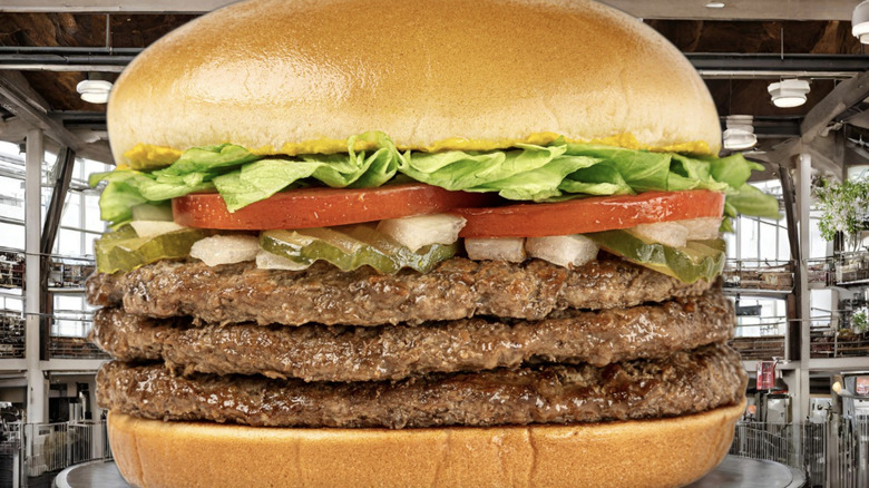 That's right, nearly every fast food chain has its own version of the hugest burger ever. So, no matter where you're located, you're bound to be in the vicinity of one of these chains, and can indulge in a large meal sure to keep you full and satisfied for many hours after. The burgers on this list are stacked high into the sky, piled with sauces, toppings, cheeses, and multiple patties (and not always just the beef kind). So put your protein pants on, and get ready to plan your next big burger experience. Here are 10 of the absolute biggest burgers you can buy from fast food chains near you.