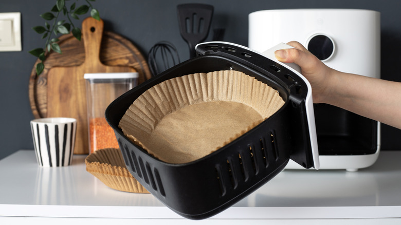 As with many other air fryer hacks, boiled eggs are a cinch with the help of this little modern countertop appliance. Preheat your air fryer to 250 degrees Fahrenheit and cook the eggs for 12 to 16 minutes, depending on how hard you'd like them "boiled." Around 12 minutes will have them come out with soft, even, slightly runny yolks; and 16 minutes will get them deliciously hardened, perfect for an egg salad or amazingly creamy deviled eggs. After cooking, you'll need to put them in a cold water bath for about 10 minutes to cool them off for easy peeling. After that, you don't even have to run water over them as you peel.