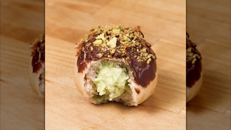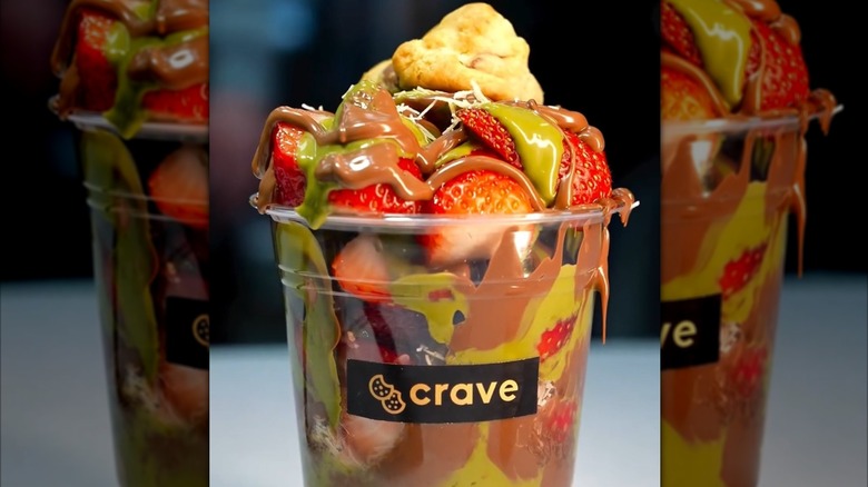 Small independent shops aren't the only ones experimenting with Dubai chocolate flavors. National chain Crave Cookies started with a chocolate cookie filled with pistachio cream, topped with kataifi, and drizzled with chocolate. The chain jumped on another trending version of Dubai chocolate by adding a little fruit to the mix and drizzling strawberries with pistachio cream, milk chocolate ganache, crushed pistachios, kataifi dough, and crushed chocolate chip cookies.