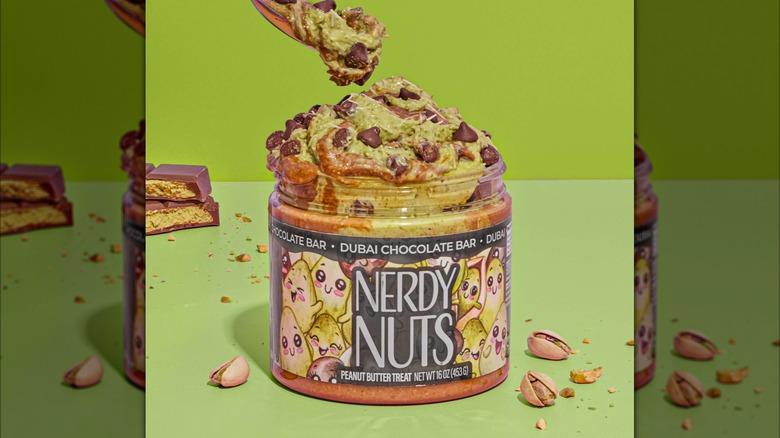 For its Dubai chocolate peanut butter treat, Nerdy Nuts swirls "smunchy" — not quite smooth, not quite crunchy — milk chocolate peanut butter with crunchy kataifi and tops it with pistachio cream and chocolate chips. And if that isn't enough of a treat, the brand also offers a Dubai Tella Brownie version that adds swirls of chocolate hazelnut spread, brownies, and mini peanut butter cups. You may want to skip the bread altogether and tackle these spreads directly with a spoon.