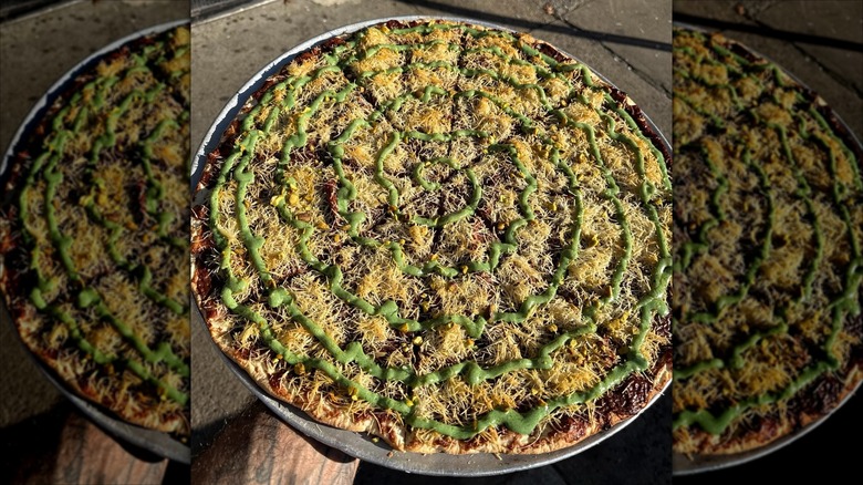 Krave It, a small chain of pizza and sandwich shops that started in Bayside, Queens, has never shied away from making interesting pizzas. For instance, the Homer Simpson pie features meatballs, bacon, glazed donuts, cheddar cheese, and maple syrup. So, it should have been no surprise when the chain introduced a Dubai chocolate pizza made with chocolate, a layer of kataifi, pistachio cream, and pistachio pieces. Although not listed on the regular menu online, Krave It's website says the pie costs $55 and a slice $8.