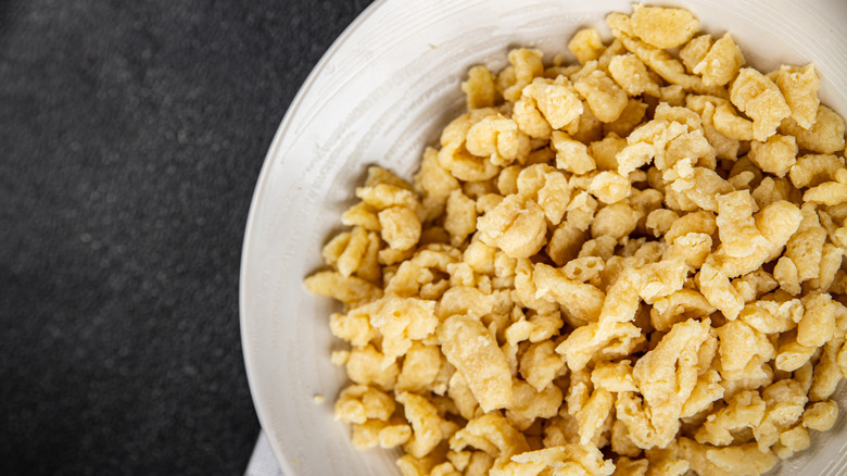 Spaetzle (or spätzle) are pasta-like egg noodles or small dumplings made with eggs, flour, and milk. While it resembles pasta, much like gnocchi, it doesn't really count as pasta. In the case of spaetzle, it's mainly due to how it's cooked — sort of part pasta, part dumpling. The wet, pourable spaetzle dough is dropped in boiling water to cook it into its chewy, sort of rope-like, ribbony form, like tiny dumplings. Although it's not technically a pasta, the end result is sort of like the tiny macaronis that Sunny Anderson also enjoys in her mac and cheese. While it can certainly be delicious covered in a cheese sauce, spaetzle is typically served covered with gravy alongside braised or roasted meats. Although quite the rich meal, the perfect comfort plate might just be Jaegerschnitzel served with a side of spaetzle and mac and cheese.