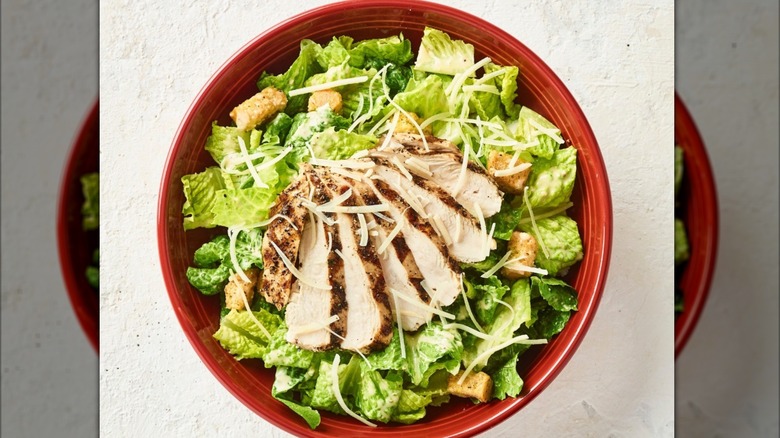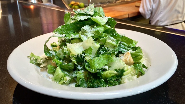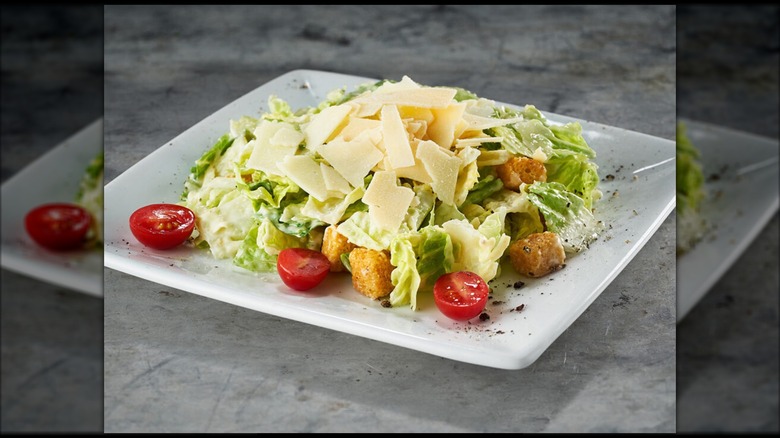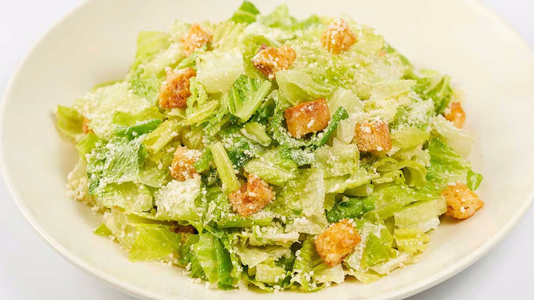 Considering that The Cheesecake Factory seems to offer everything you could possibly want from a restaurant and more, it's no surprise that Caesar salad is on the menu. The standard version includes lettuce with croutons, Parmesan cheese, and Caesar dressing that's made in-house. Like many dishes at The Cheesecake Factory, it can be modified with add-ons like grilled chicken, shrimp, avocado, salmon, or steak.