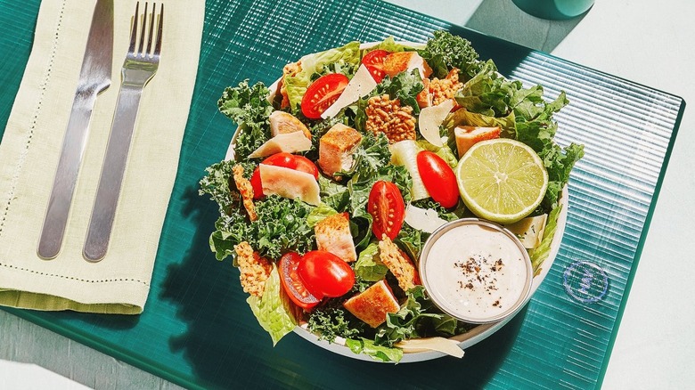 Peruse Sweetgreen's menu and you'll find an array of vibrant creations made with colorful veggies, hearty proteins, and fun sauces. The Kale Caesar Salad is a fan favorite with its mix of chopped romaine, shredded kale, cherry tomatoes, shaved Parmesan, and Parmesan crisps. It comes with either roasted chicken or caramelized garlic steak, and it gets a squeeze of lime juice and Caesar dressing on the side.