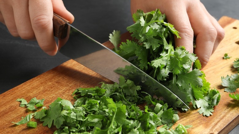 Before cooks with the "cilantro tastes like soap" gene feel like they're missing out (after all, even chefs like Ina Garten and Julia Child share their hatred for the herb), some people find that acidity, such as the rice vinegar in tiger salad's dressing, helps to downplay the soapy taste. The dressing contains a variety of strong ingredients, including sugar, sesame oil, and soy sauce, which lend the salad a vibrant taste by balancing the sour and bitter elements of cilantro with mildly sweet and umami flavors. Pungent onions and peppers in the recipe may also help to negate the soapy effect, as they pack a strong flavor in every bite.