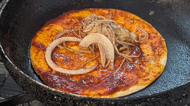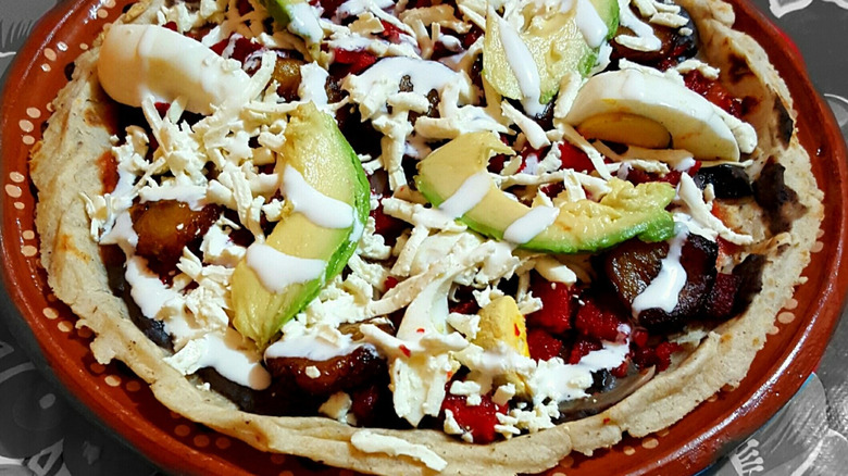 Often described as a "Mexican pizza," tlayudas are one of the most iconic antojitos from the southern state of Oaxaca. Built on a large, thin corn tortilla that has been partially dried to give it a distinctive snap, the tlayuda is brushed with asiento (unrefined lard), then layered with refried black beans, crumbled cheese, shredded lettuce or cabbage, and any number of toppings, ranging from grilled meats, like tasajo or cecina, to sliced avocado and fresh salsa. Once assembled, the whole thing is folded over and charred briefly on a comal or over an open flame, creating a smoky, crunchy, and deeply satisfying street meal.
