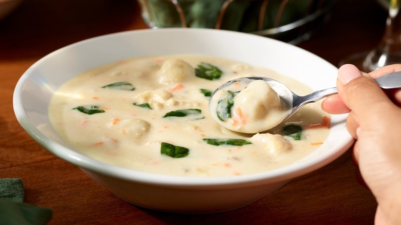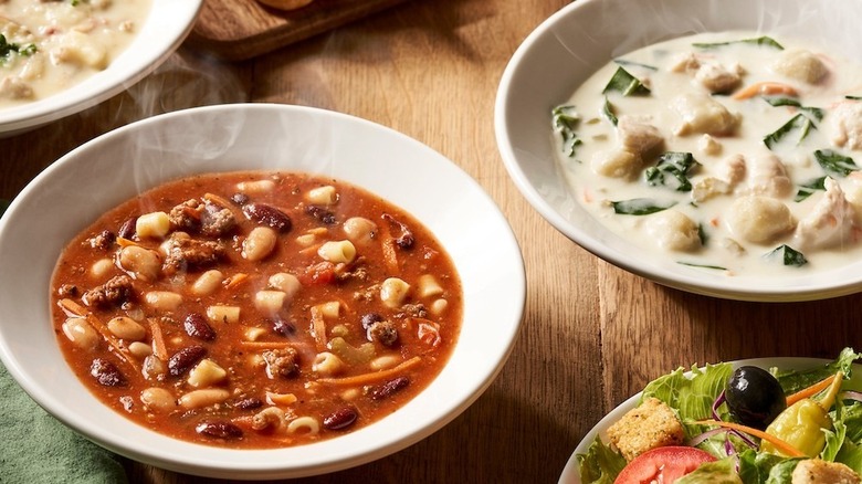 Multiple Olive Garden employees have confirmed that the soups are made from scratch in-house. As one TikToker who worked at the chain explained, the soup is made fresh in giant pots, then portioned out into one-gallon bags and chilled to preserve its integrity. It's taken out when needed and reheated, then fragile ingredients like spinach and kale are added right before serving.