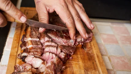 Chowhound talked to Jonathan Bautista, executive chef at Ember & Rye in Carlsbad, California, to get the skinny on whether you should use a serrated knife to slice into steak, or if it makes more sense to use a straight-edge knife to get a smoother cut. According to Bautista, you want to stay away from serrated knives if you can. Steak knives are typically serrated and tend to tear into meat, but when it comes to slicing and serving steak for a crowd, he says "it doesn't really matter how much it costs or what type of knife it is, so long as it's sharp and preferably not serrated when serving." The length of the knife also matters. Bautista recommends choosing a knife that's at least an inch longer than the steak you're slicing so you get a consistent slice without a ton of knife movement.