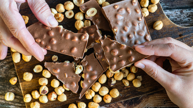 The sweet treat craze is alive and well thanks to social media. There are a slew of ways to get your fix with two simple components that also offer a variety of health benefits: Whole hazelnuts and dark chocolate. Even better, you may find these ingredients are already in your home (or just a short trip to the grocery store away). Once you have your materials, you need a double boiler to melt the chocolate and a parchment-lined baking sheet to pour your chocolate-hazlenut mixture into (so it's easy to remove once you take it out of the fridge after setting). It's as simple as that.