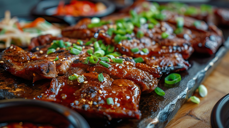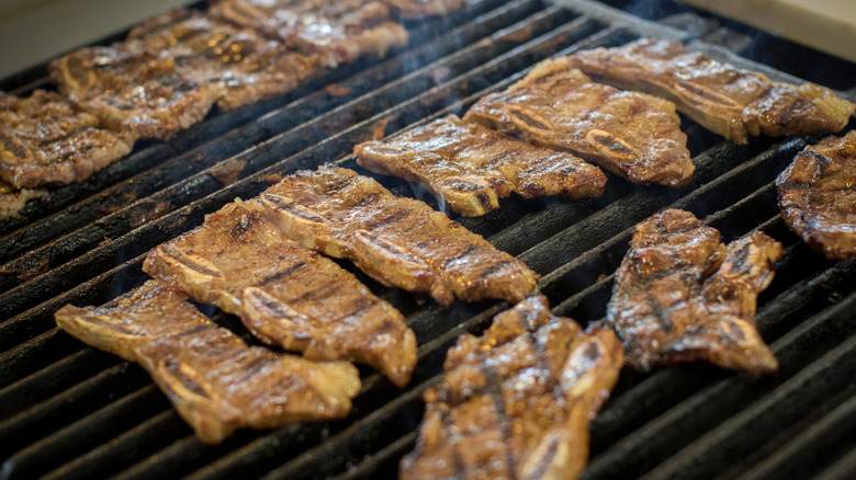To find out more, we spoke to Scott Thomas, owner of The Grillin' Fools. "Flanken-cut ribs are cut thin, across the bones of the ribs. Thus, each one has many small cross sections of the rib bones lined up along the length of the cut," he explained. Reminiscent of the Korean barbecue classic galbi, the thickness (or rather, the lack thereof) of these short rib pieces respond to heat differently, and can't be cooked in the traditional low-and-slow fashion. Instead, treat them like other grill classics, searing them to quickly lock in flavor. "I cook these hot and fast over direct heat like a steak," Thomas said. That way, you get the delicious smoky flavor of the grill, without overcooking or drying out your meat.