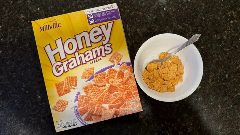 Aldi shoppers know time stops when you enter the cereal aisle because you have to choose the best possible breakfast for your morning bowl. Shopping in Aldi is one of the best places to find deals and some great dupes that taste just like the originals, including cereals. Whether you're a fan of sweet and simple bowls of cereal, or are down to make your bowl more filling with loaded cereal, there really is nothing like having the right option on deck. When Chowhound tasted and ranked the best Aldi-brand cereals, there was one box worth keeping in the pantry: Millville Honey Grahams.