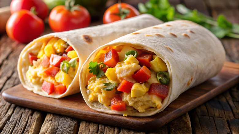 In addition to the aforementioned ingredients, consider incorporating some tangy sour cream into your burrito. Add a dollop of it atop your breakfast bowl or spread it straight onto the tortilla. You might also quickly chop up some green onion or cilantro, or include another kind of cheese than what's already in the bowl, such as Monterey Jack or a kicky pepper Jack. If you have some crumbly cotija, the salty Mexican cheese would also make a yummy addition.