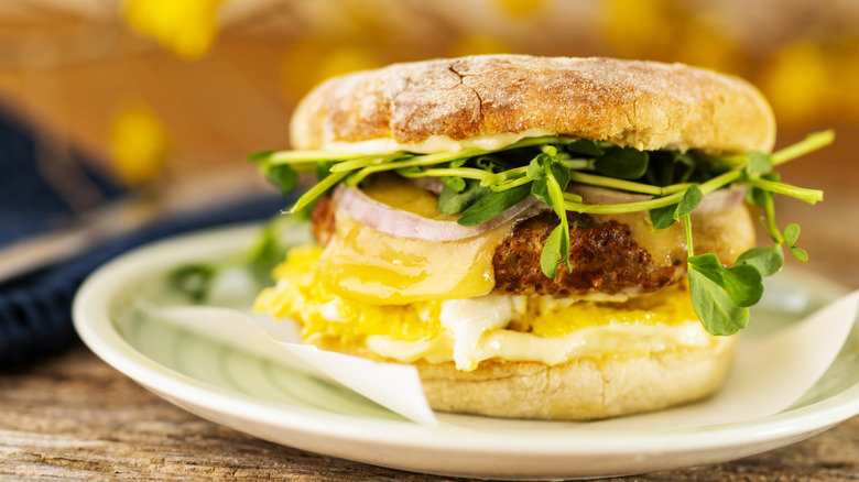For instance, the prolific cookbook author showed viewers of his "Cooking at Home" series (via YouTube) how to make an open-faced English muffin sandwich for lunch. Named for his wife, Gloria, who likes to make it the savory snack, it featured tomatoes, anchovy fillets, sweet onions, and mozzarella piled atop English muffins that have been toasted several times. Pépin also has a recipe for burgers in which he swaps classic buns for English muffins. He notes that he usually toasts the yeast-leavened bread featuring a crater-like appearance inside twice because he likes them to be "nice and brown."