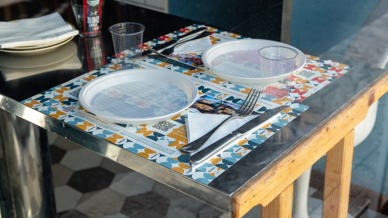 Look for vinyl placemats with bottoms that prevent them from sliding around too much to ensure nothing gets shifted while it's stored. If you can't find them at your local dollar store, there are some reasonably inexpensive options on Amazon, too, such as Mosayt's four-pack of vinyl placemats — and they come in nice patterns. You can even color-code them according to which items should go on which shelf for easier organization (or just to give your fridge a fun look).