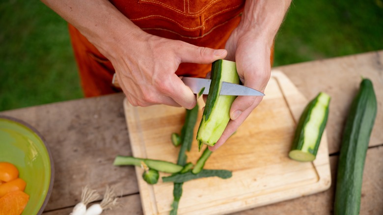 Delicious, crunchy, and unbelievably refreshing, cucumbers are the ultimate go-to snack we all turn to during the summer period to beat the heat. That should come as no surprise, considering how cucumbers are basically made of 96% water. Whether pickled and upgraded with soy sauce for an umami kick, or sliced and mixed into classic Greek salad along with some tomatoes, red onions, olives, and feta cheese, these crisp cucurbits are incredibly versatile. And they seem to have no drawbacks — except when it comes to their waxy skin.