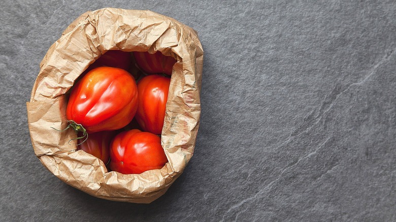 To use this technique at home, place your bag of tomatoes in an area of your house that generally sits between 70 and 75 degrees Fahrenheit. Additionally, don't overcrowd your paper bag with too much produce; each enclosed tomato should be sitting flat against the surface with room on all sides. And, even with this effective method, there are still a few more creative ways you can speed up the ripening process if necessary.