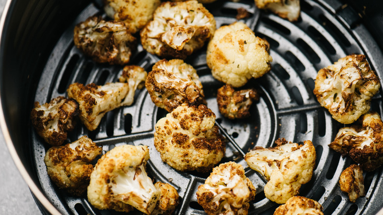 When frozen vegetables are defrosted, they begin to release the moisture trapped by those low temperatures in your freezer, so they can start to get soggy. Putting them straight into a blazing hot air fryer doesn't give that moisture a chance to soak into the veggies. That being said, some vegetables like bell peppers, cauliflower, and broccoli hold up to the freezing process better, so if you're just dying to thaw your veggies beforehand, it isn't going to hurt these varieties. Even so, it saves time and effort to simply pop them in, press a button, and give it a few minutes.