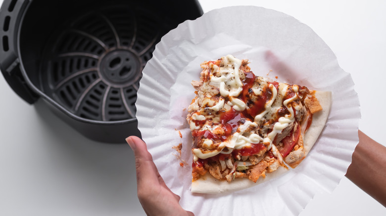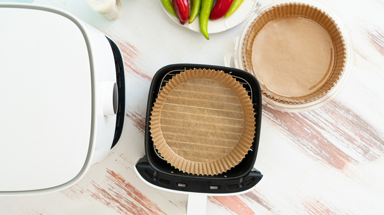 With that scenario in mind, it's our pleasure to point out the wonderfully heat-resistant hack that is parchment paper. Commonly used to line baking sheets, parchment paper can handle temperatures well over 400 Fahrenheit as well as prevent sticking and make clean-up that much easier. Many times, you can even find specially shaped parchment paper liners specifically made to line air fryers. While it may be tempting to use aluminum foil for the same purpose, always use caution to ensure that said foil can't be blown loose inside the air fryer — if it touches the heating mechanisms, it can be a major fire hazard. Parchment paper is a far safer solution.