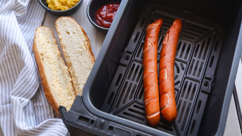Nothing says summer more than firing up the grill to make burgers and hot dogs. However, when you don't want to go all out, your air fryer is here for the win when it comes to making crispy hot dogs. Air-fried hot dogs won't have the same smoky flavor as when they are cooked on a grill, but air fryers get the texture pretty darn close. The rapid convection style of cooking ensures your hot dogs are crispy on the outside and juicy on the inside in a matter of minutes. You can go ahead and toss your hot dog buns in the air fryer for a quick toast as well.