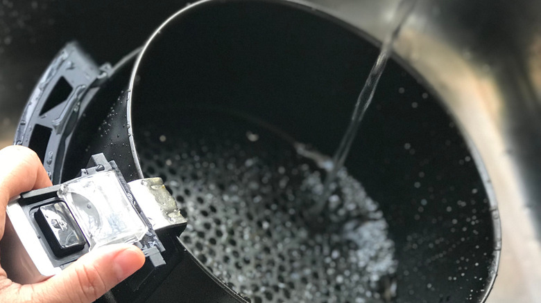 To start with, always try to clean your air fryer shortly after use, but wait for all the components to cool down first. If you can't get to it right away, it's okay to soak your air fryer's pan and inner basket in warm soapy water for a little while. You can even make a paste out of water and baking soda to help dissolve especially tough grime. Perhaps most importantly though, you should never use sharp utensils or abrasive sponges or brushes in the cleaning process, as many air fryers have a protective nonstick coating that can be damaged if you don't stick to a gentler means of cleaning. Remember to wipe the interior chamber of the main unit with a damp towel too, as crumbs and oil can and will accumulate there. And while some air fryers have components that are dishwasher safe, for longevity's sake it's usually a good idea to hand wash or at least confirm the best cleaning method with your model's manual.