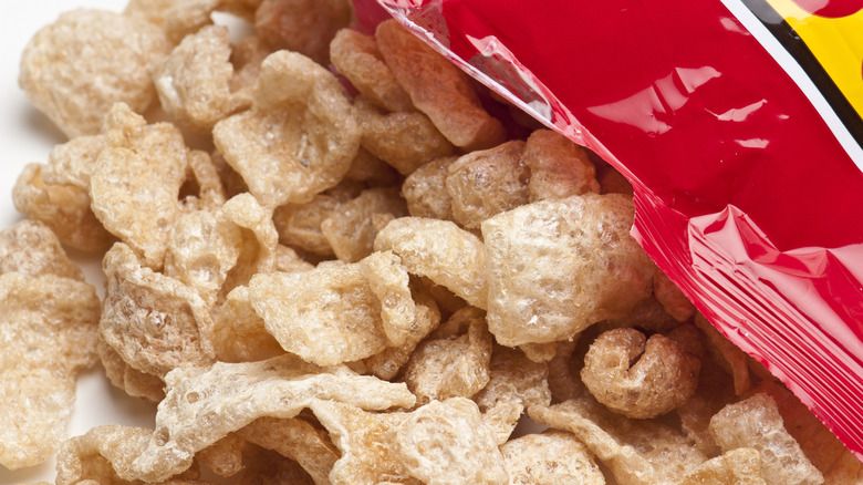 This recipe isn't just out of the box, it's right out of the gas station snack bag, and we promise you'll be impressed. To properly elevate your fried chicken, just be sure to use the fully-dried pork rinds. They don't necessarily have to be from a gas station or convenience store, but if you're getting them fresh from a deli or specialty store, ensure that they're dried, crunchy, and easy to grind or smash into a "pork flour." You can use a food processor or blender, or simply put them in a resealable bag and roll a rolling pin over them to crush them up.