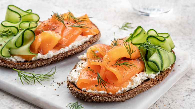 You can put pieces of the salmon on rye bread with creamy spreadable cheese. Like other Russian-style sandwiches, cucumber can add some nice crunch, but a pickled version adds a little bit of tang as well.