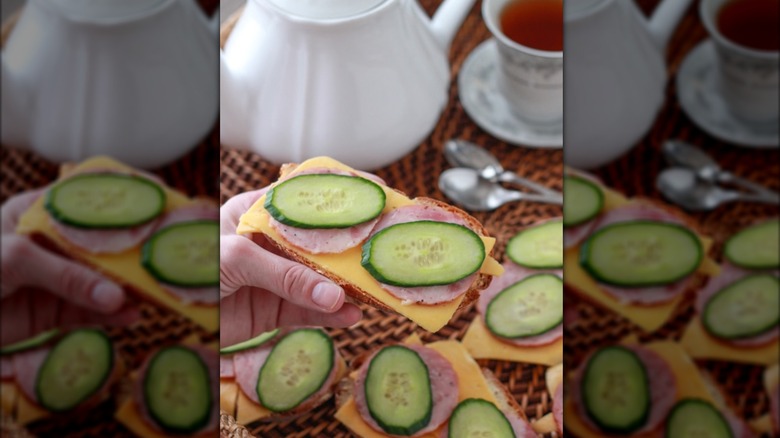 Russian tea sandwiches are the most well-known sandwich from the country, so if you've ever tried a sandwich hailing from Russia, this is probably the one that you came across. They are typically a combination of salty meat, creamy cheese, and mayo, but it's the addition of crunchy cucumbers that brings in that extra bit of texture the sandwiches need.