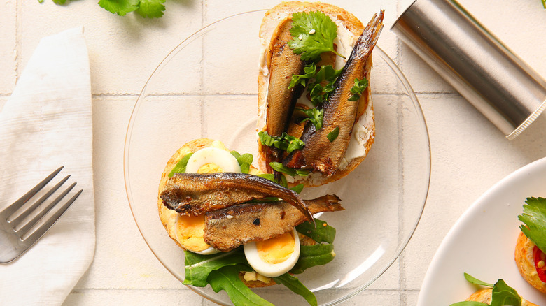 The first time that you see a sprat buterbrodi sandwich, there's definitely one ingredient that stands out from the others. Sprats are a small oily fish similar to sardines that bring a briny but rich flavor to dishes. In this traditional Russian sandwich, smoked sprats that come in tins are most often used. If you can't find sprats, sardines will bring a similar flavor to your sandwich.