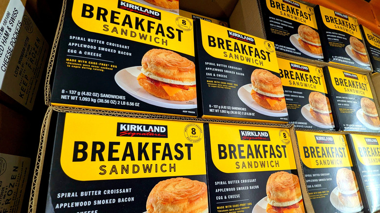 Breakfast sandwiches from Starbucks or your favorite bagel place are convenient but can be pricey after a while. If you're trying to eat breakfast at home more often to save some money, you'll love Costco's frozen version. The Kirkland Signature sandwich is a buttery spiral croissant that's filled with applewood-smoked bacon, eggs, and cheese. And the sandwiches come fully cooked, so they heat up in the microwave in just over one minute, but you can also try making them in the air fryer for a crispier take. This breakfast sandwich also came top in our ranking of the best frozen breakfast sandwiches out there, so it's worth a try.