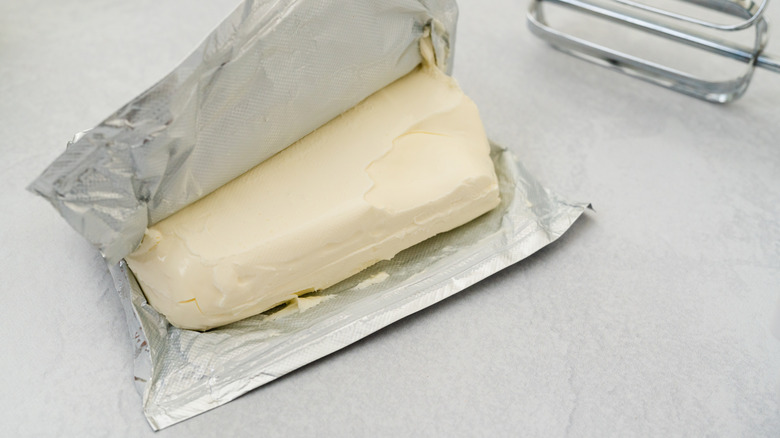 If you plan on giving this dish a go, it's crucial to soften the cream cheese so you can mix other ingredients into it and form a spread that can be evenly applied to the top of your fish. While you don't necessarily have to add spices, herbs, or alliums to the mix, doing so will definitely result in a more flavorful bite. One simple way to soften cream cheese without melting it is to stick the whole block, with the foil wrapper still on, in a bowl of hot water for 10 to 15 minutes. When you're ready to spread it onto your salmon, expect your fingers to get a little messy. You'll likely find that if you try to flatten it down using only a utensil, the cream cheese will stick to it.