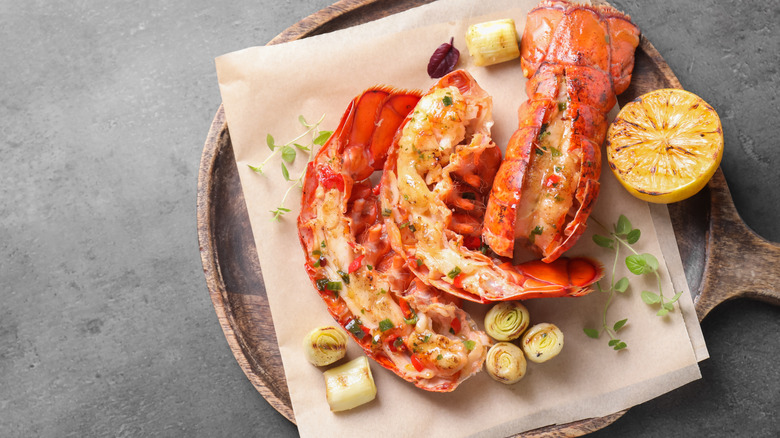 The hardest part might just be cutting through the lobster's shell; every lobster lover should know the trick for easy shell removal. Once you've got that figured out, the next bit will be a breeze, as you'll just need to squeeze in some lemon slices under the meat. Spreading some mayonnaise on top might throw you for a loop, but it allows the meat to be moist, juicy, and tender, which is why you need mayonnaise for the best grilled shrimp and fish. It even makes an appearance in some of your favorite grub that you probably didn't know included it, like cakes, jalapeño poppers, and grilled cheese. The result won't taste like mayonnaise, though, so even if you don't want this ingredient anywhere near your food, you'd still be able to enjoy the dish. As a finishing touch, sprinkle some Old Bay seasoning, and cook the lobster tail in the air fryer for 8 to 10 minutes to achieve perfection.