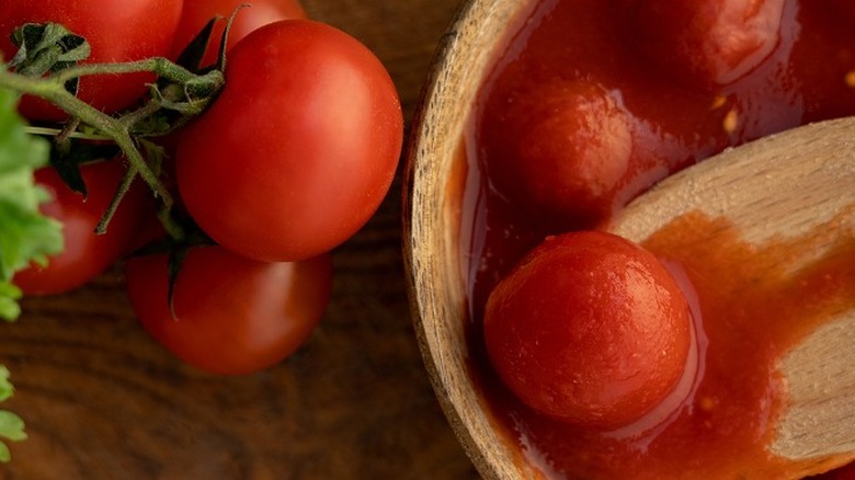 Most common whole tomato varieties have a canned option available at the store, but there are certain instances where fresh whole tomatoes are a must. Coleman's exception, for instance, is cherry tomatoes. He uses cherry tomatoes to add an element of surprise through a pop of color or texture, and they can be used in dishes such as frittatas or braised meats. (You can also grow fresh cherry tomatoes at home, as they're the easiest beginner variety of tomatoes.)