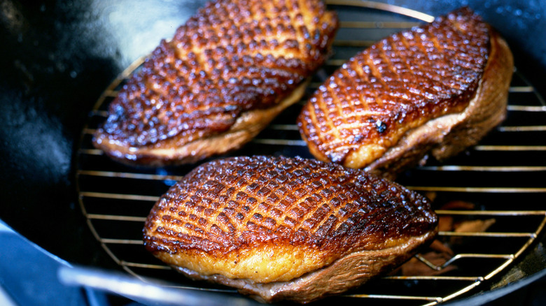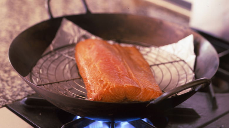 Converting a wok into a smoker takes some effort and a few rolls of tin foil, yet once you've built your setup once, there's an exciting array of applications to explore. For one, the relatively small amount of necessary smoking fuel lets you flavor with varying aromas. Classic wood chips present an excellent starting point: They're easy to find and translate with especially bold flavor. Feel free to experiment with the best types of wood to use for smoking. Mesquite and applewood are common options. Furthermore, don't rule out other smoking bases. Feel free to throw in spices, leaves, citrus peels, grains, tea, and even sugar as a smoking base. Since the process is brief — running under 20 minutes — you can imbue flavors before these foodstuffs start to burn. You could even form a blend, creating some incredibly intricate aromas to imbue.